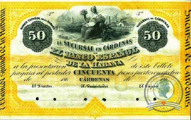 Emisión de papel moneda del Banco Español de La Habana para la Sucursal de Cárdenas que no se llego a emitir. Solo se conocen los specimen con taladros. Uniface. Impreso en la American Banknote Co.